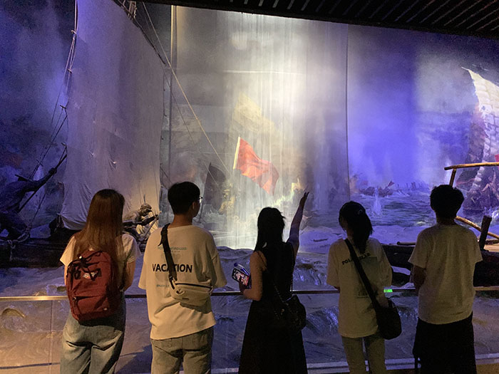 在這里,我們了解到解放戰爭中渡江戰役持續了四十二天,人民解放軍用木帆船作為航渡工具,一舉突破國民黨軍的長江防線,靈活運用運動戰和城市攻堅戰相結合的方式,重創其重兵集團。館內還有一句讓我們觸目驚心的名言“宜將剩勇追窮寇,不可沽名學霸王。”百萬大軍就靠一艘艘破舊的漁船砥礪前行,墻上的烈士名錄向我們訴說著“攻堅克難、勇于犧牲”的精神。渡江戰役中,人民解放軍從數量和士氣上占有絕對優勢,但國民黨軍有波濤洶涌的長江之水做防線,有裝備精良的正規部隊,有江防艦隊、第二艦隊及飛機協同防御。渡江大軍以單一兵種對付敵人陸?樟Ⅲw防線,以小木船來對抗軍艦。沒有攻堅克難、勇于犧牲的精神,要想取得勝利是根本不可能的。解放軍們高喊“打過長江去,解放全中國!”就是有這不畏犧牲的精神從長江下游一路打到長江外的崇明島,至此,渡江戰役勝利結束。