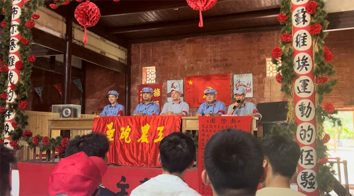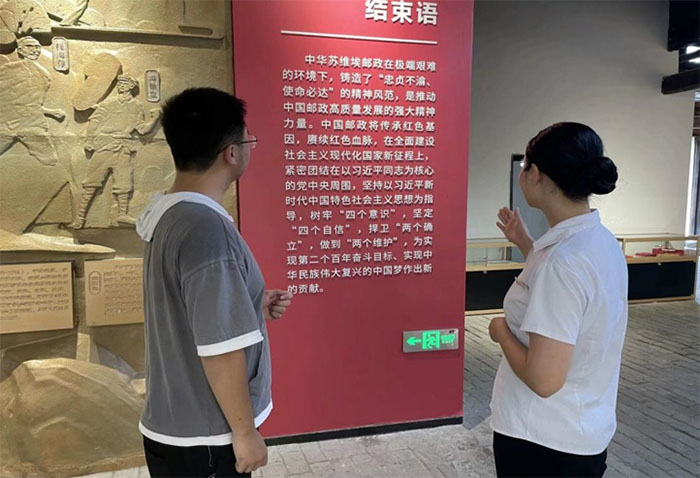實踐團通過二蘇大景區(qū)、的參觀調(diào)研,深入學習瑞金紅色革命歷史,在瑞金葉坪中華蘇維埃主題郵局,郵局工作人員為我們講解黨領(lǐng)導下的紅色金融歷經(jīng)大革命時期至新中國建國初期紅色金融事業(yè)萌芽到社會主義改造期新的偉大革命的考驗,在經(jīng)濟浪潮的洗禮中留下了一串串光輝的足跡,創(chuàng)造了一個又一個彪炳史冊的奇跡,實踐團成員在交流探討、郵戳蓋章、拓印實踐學習、VR暢游體驗,探尋革命先烈留下的印記,領(lǐng)悟軍隊革命精神,深刻體會到黨領(lǐng)導下的金融事業(yè)不平凡發(fā)展歷程是一部百折不回、波瀾壯闊的金融發(fā)展史, 也是一段為探索中國金融發(fā)展道路而矢志不渝、開拓創(chuàng)新的輝煌黨史;實踐團成員進而以“參會者”的身份沉浸式體驗一蘇大工農(nóng)紅軍領(lǐng)導人會議選舉,并在與會結(jié)束奏響國際歌后,與國防教育單位工作人員進行交流討論記錄,進一步學習革命軍隊文化,實踐團成員中的退伍軍人章榮焱對此感慨頗深,他表示:比盛夏更炙熱的,是中國軍人的熱血軍魂。