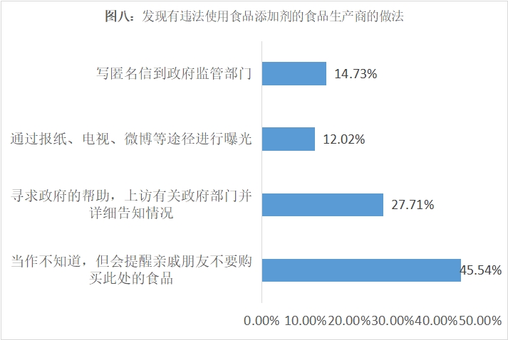 由圖八可知,當(dāng)發(fā)現(xiàn)有違法使用食品添加劑的食品生產(chǎn)商的做法,有27.71%的人尋求政府的幫助,上訪有關(guān)政府部門詳細(xì)告知情況,有12.02%的人通過報(bào)紙、電視、微博等途徑進(jìn)行曝光,有14.73%的人寫匿名信到政府監(jiān)管部門,而有45.54%的人當(dāng)作不知道,但會(huì)提醒親戚朋友不要購買此處的商品,可能是因?yàn)榕e報(bào)過程比較麻煩、費(fèi)時(shí)等原因。但是總體上來說,大部分人都愿意對(duì)違法使用食品添加劑的食品生產(chǎn)商采取措施,說明群眾的食品安全意識(shí)在逐步加強(qiáng)。