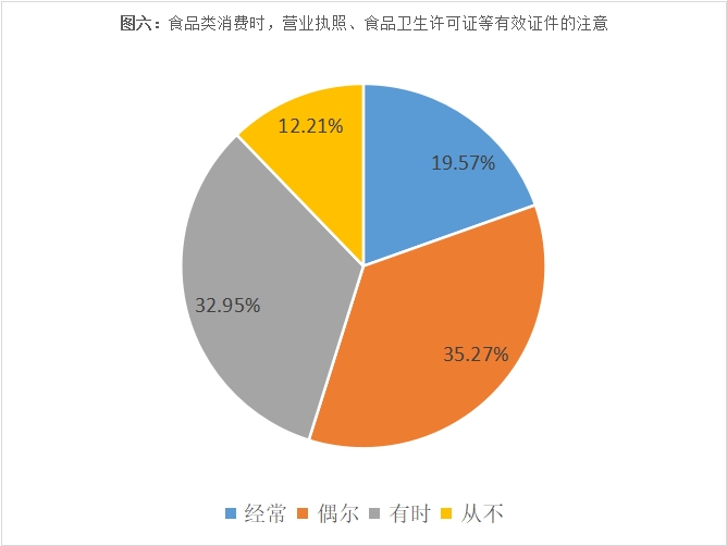 由圖六可知,有19.57%的人在進(jìn)行食品類消費(fèi)時(shí),經(jīng)常注意相關(guān)的營(yíng)業(yè)執(zhí)照、食品衛(wèi)生許可證等有效證件,有35.27%人偶爾注意,有32.95%的人有時(shí)注意。這說明我國(guó)食品安全的關(guān)注總體來說做的比較到位,但是仍然12.21%的人從不注意,這說明仍然有一些人對(duì)食品安全不夠重視,可能是因?yàn)槿罕妼?duì)食品了解太少。所以各地政府應(yīng)該監(jiān)督該地區(qū)的食品安全宣傳工作落實(shí)到位,并且在向廣大群眾宣傳時(shí)宣傳內(nèi)容應(yīng)該通俗易懂,帶動(dòng)廣大群眾一起積極投身于食品安全的建設(shè)工作中來。