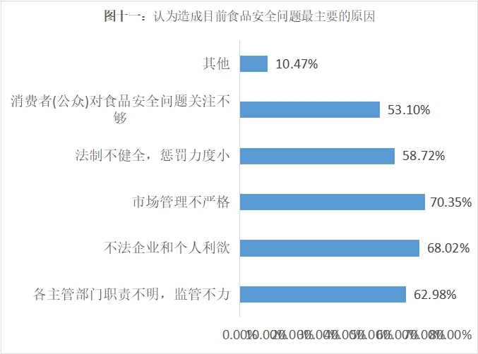 由圖十一可知,認(rèn)為造成食品安全問題最主要的原因有各主管部門職責(zé)不明,監(jiān)管不力、不法企業(yè)和個(gè)人利欲、市場(chǎng)管理不嚴(yán)格、法制不健全,懲罰力度小、消費(fèi)者(公眾)對(duì)食品安全問題關(guān)注不夠等,所以群眾認(rèn)為我國(guó)在食品安全建設(shè)過程中仍存在較大的問題。因此,加強(qiáng)對(duì)食品的管制與監(jiān)督,加強(qiáng)對(duì)我國(guó)的食品立法力度,切實(shí)保障人民的健康,讓大家吃得安心,對(duì)健康放心。