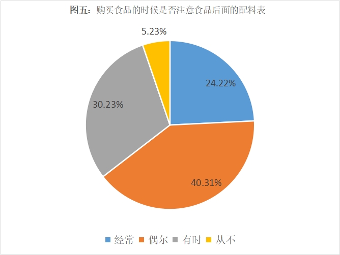 由圖五可知,有24.22%的人購買食品的時(shí)候經(jīng)常注意食品后面的配料表,說明食品安全意識(shí)已經(jīng)非常強(qiáng)烈,有40.31%的人偶爾注意,有30.23%的人有時(shí)注意,但有5.23%的人從不注意。由此可看出,我國(guó)少部分人的食品安全意識(shí)落實(shí)較為到位,但是仍有一小部分食品安全意識(shí)比較單薄,仍需要進(jìn)一步加強(qiáng)食品安全的建設(shè)。