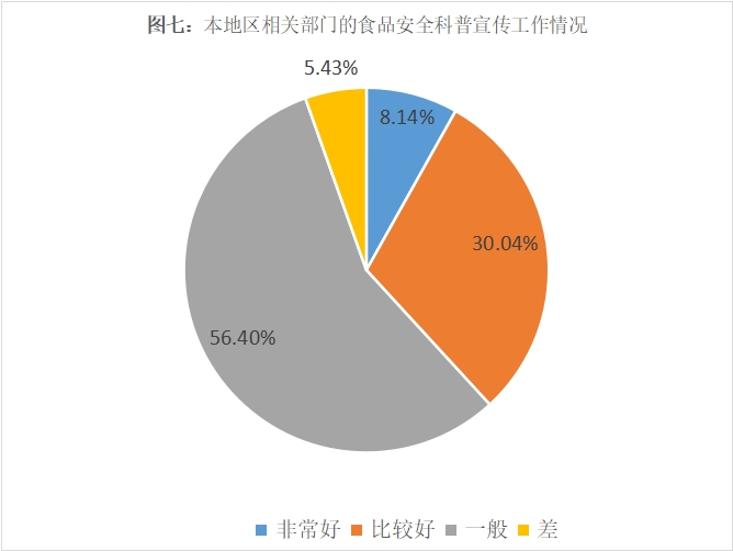 由圖七可知,有一半以上的人認(rèn)為本地區(qū)相關(guān)部門的食品安全科普宣傳工作做的一般,有5.43%的人認(rèn)為較差,但有30.04%的人認(rèn)為比較好,有8.14%的人認(rèn)為非常好,說明大多數(shù)人的食品安全科普宣傳工作做的比較到位,且有意愿共同去學(xué)習(xí)相關(guān)的食品安全的科普知識(shí)。而面對(duì)宣傳不到位的情況,要擴(kuò)大社區(qū)的宣傳力度,保證每個(gè)人對(duì)食品安全有一定的認(rèn)識(shí)。