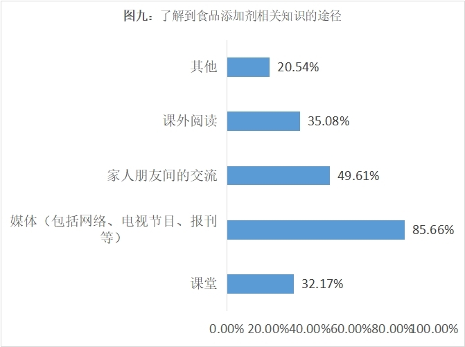 由圖九可知,大部分人都會(huì)采取媒體(包括網(wǎng)絡(luò)、電視節(jié)目、報(bào)刊等)來了解到食品添加劑的相關(guān)知識(shí),還有部分人采取了家人朋友間的交流、課外閱讀、課堂等形式。由此可說明網(wǎng)絡(luò)對(duì)大家普及食品添加劑相關(guān)知識(shí)中發(fā)揮了重要作用,在日常的了解過程中,群眾參與率較高。