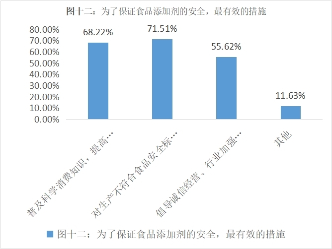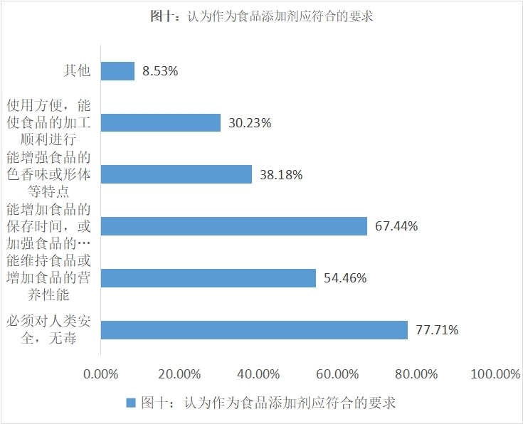 由圖十可知,大多數(shù)人認(rèn)為食品添加劑能增加食品的保存時(shí)間,或加強(qiáng)食品的安定性,減少食品營(yíng)養(yǎng)成分的損耗且必須對(duì)人類安全,無毒,其原因可能是現(xiàn)如今人們對(duì)健康越來越重視,對(duì)食品添加劑也開始重視起來;也有部分人認(rèn)為其要能維持食品或增加食品的營(yíng)養(yǎng)性能、能增強(qiáng)食品的色香味或形體等特點(diǎn)使用方便、能使食品的加工順利進(jìn)行等要求,由此可看出隨著我國(guó)經(jīng)濟(jì)的高速發(fā)展,人民生活水平的提高和生活節(jié)奏的加快,人們對(duì)食品提出了越來越高