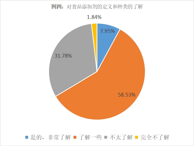 由圖四可知,有超過一半的人對(duì)食品添加劑的定義和種類了解一些,有三分之一以上的人對(duì)食品添加劑的定義和種類不太了解,有1.84%的人對(duì)食品添加劑的定義和種類完全不了解,但有7.95%的人對(duì)所在地區(qū)的生態(tài)文明建設(shè)工作非常了解。這個(gè)數(shù)據(jù)說明我國(guó)食品安全意識(shí)比較強(qiáng),但是仍然存在不足的地方,可能是因?yàn)椴糠值貐^(qū)食品添加劑知識(shí)宣傳不到位,也可能是因?yàn)槭称钒踩吖ぷ魑绰鋵?shí)到位等等,所以各地區(qū)應(yīng)該加強(qiáng)食品安全的建設(shè)工作,并不斷進(jìn)行總結(jié)反思,執(zhí)行相應(yīng)的措施,使我國(guó)食品安全更上一層樓。