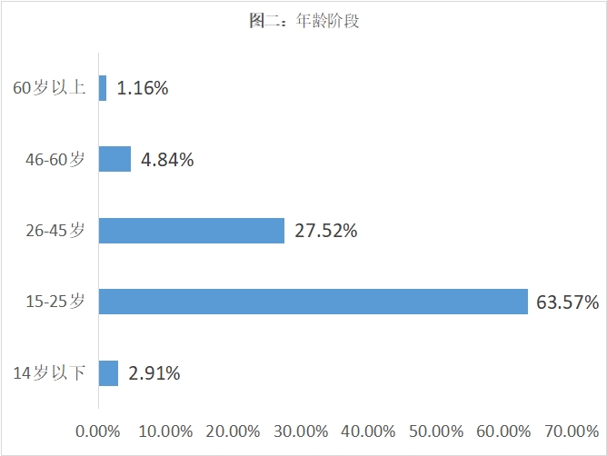 此次調(diào)查對(duì)象的年齡段結(jié)構(gòu)分布如圖二所示,由圖可知,調(diào)查對(duì)象涵蓋了不同年齡段的群體,其中15-25歲的群體相對(duì)較多,占有效調(diào)查人數(shù)的一半以上,其原因可能是因?yàn)閳F(tuán)隊(duì)成員在發(fā)放問卷時(shí)對(duì)這個(gè)年齡段的人群接觸較多,所以該年齡段填寫問卷的人數(shù)也較多;其次是26-45歲的群體占總?cè)藬?shù)的27.52%。但是本次調(diào)查涉及的人員性別及年齡段比較全面,仍符合隨機(jī)調(diào)查的初衷,保證了此次調(diào)查結(jié)果的代表性和可信性。