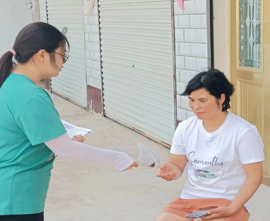 圖為團隊成員在給許女士宣傳保護麋鹿接下來在發傳單的過程中陸陸續續地采訪了許多人,發現年輕人對保護麋鹿是有較強的意識且講出了自己對濕地及生態環境變化的看法,中年人大多知道大豐麋鹿是景點和是國家保護動物,而老年人則是幾乎不了解。