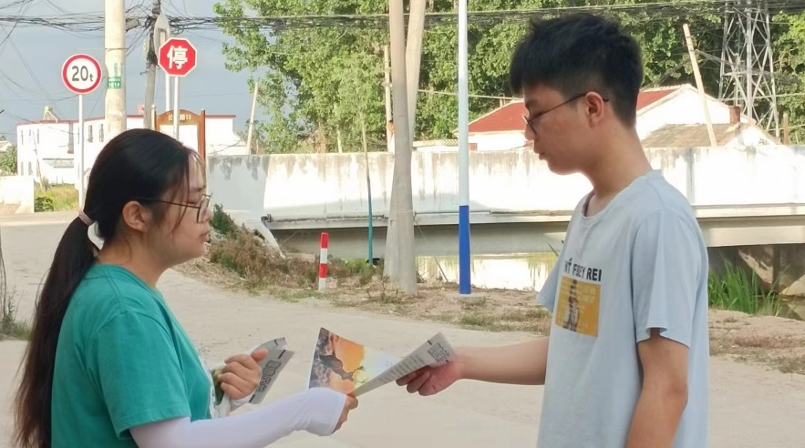 圖為團隊成員在分發傳單該位同學說思考了一會說:“要想保護麋鹿就應當保護好濕地,而要想保護好濕地,就應當阻止農業圍墾、城市用地造成的濕地大面積縮減以及大量工農業廢水、生活污水的排入造成的嚴重的濕地污染。如果這樣做的話,濕地將慢慢變好,麋鹿也得到了保護。”