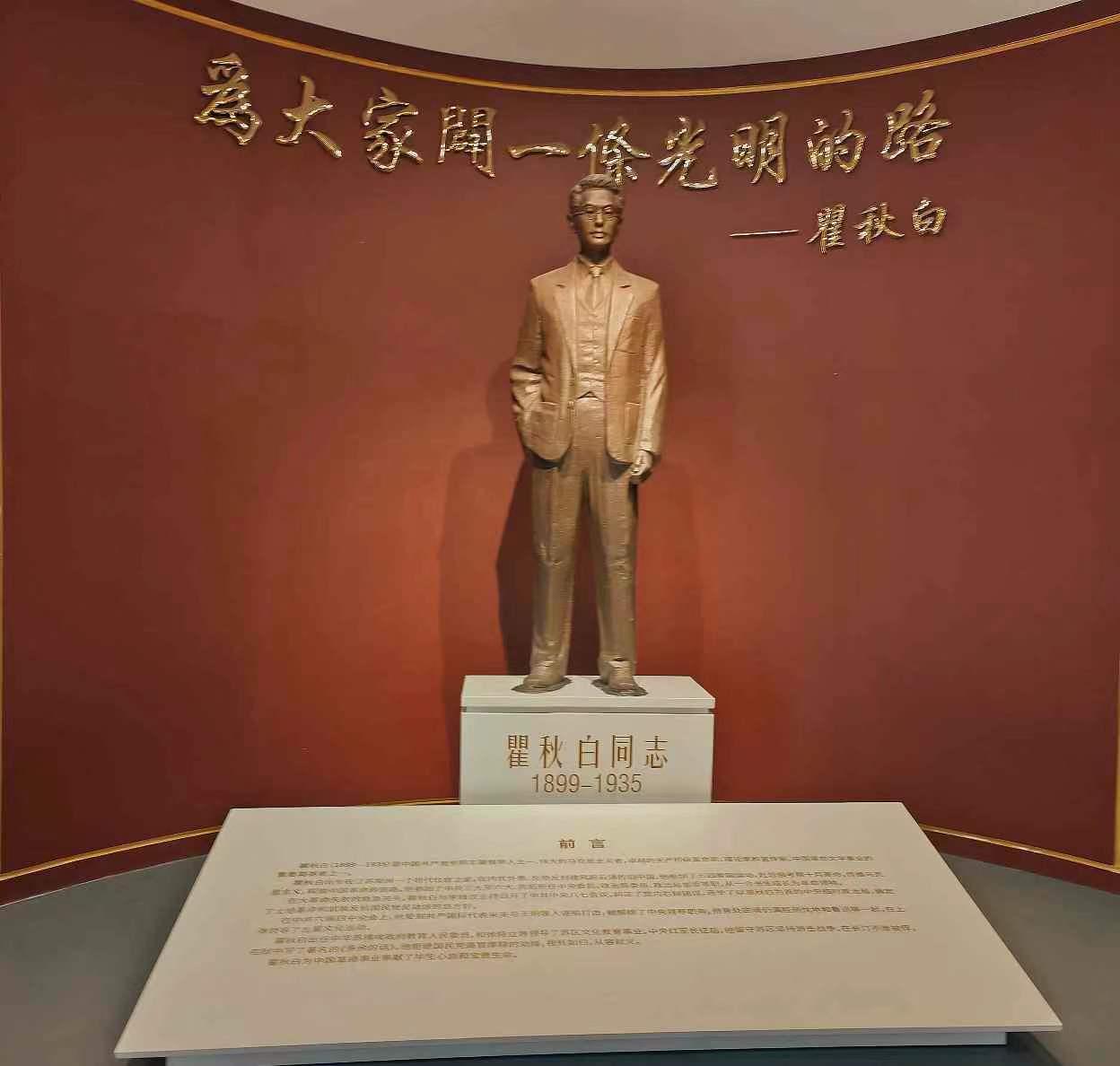 動(dòng)中國(guó)革命事業(yè)做出了不可磨滅的貢獻(xiàn)。在瞿秋白紀(jì)念館門口有那么一塊石碑,那是瞿秋白英勇就義的地方。八十多年前,在他生命的最后時(shí)刻,36歲的瞿秋白唱著自己翻譯的《國(guó)際歌》走向刑場(chǎng)。在刑場(chǎng),他就說(shuō)了四個(gè)字“此地甚好”,然后盤膝而坐,面對(duì)槍決,他以從容不迫的氣度結(jié)束了轟轟烈烈的一生。為了心中信仰,他用鮮血踐行著錚錚誓言。瞿秋白對(duì)革命事業(yè)如此真摯的感情讓實(shí)踐團(tuán)成員無(wú)一不動(dòng)容。隨后,隊(duì)員們一行走進(jìn)瞿秋白紀(jì)念館內(nèi)。紀(jì)念館內(nèi)陳列著豐富多彩關(guān)于瞿秋白生平的歷史資料,生動(dòng)形象地再現(xiàn)了瞿秋白赴俄學(xué)習(xí)先進(jìn)的蘇維埃理念后回國(guó)反哺中國(guó),為中國(guó)革命事業(yè)奉獻(xiàn)自己畢生心血和生命的一幕幕場(chǎng)景。在講解員的引領(lǐng)下,實(shí)踐隊(duì)成員對(duì)瞿秋白烈士的一生有了更加深入的理解,更加堅(jiān)定了自己的理想信念,立志做信念堅(jiān)定的新時(shí)代好青年。