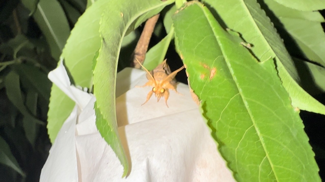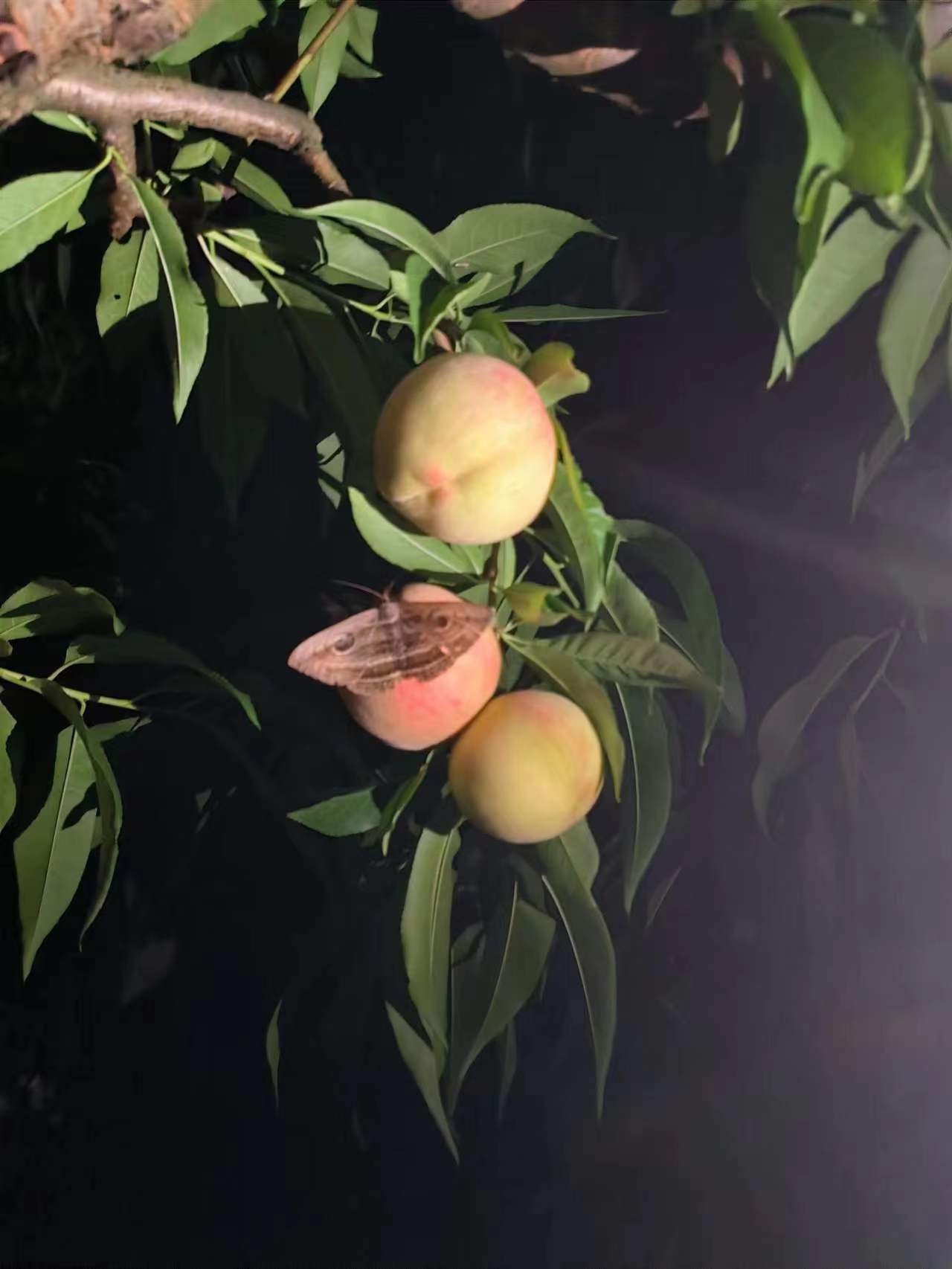 食誘劑是一種常見的綠色生物防控技術,目前對于吸果夜蛾,多采用基于花香和發酵糖水氣味的鱗翅目害蟲廣譜型食誘劑。實踐團隊嘗試采用對吸果夜蛾引誘力較強的水果,例如芒果和香蕉。通過將這些水果放置在捕蟲網兜下方,成功地吸引并捕獲了大量的吸果夜蛾,同時團隊成員也在吸果夜蛾活動的時間(晚上9-10點),對吸果夜蛾進行人工捕捉,捕獲了大量正在桃子上吸果的夜蛾。