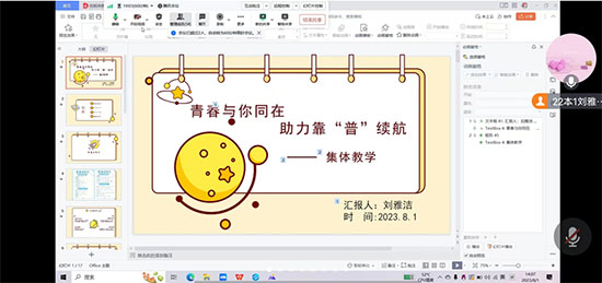 線上團(tuán)隊成員以直播和視頻的形式對新疆同學(xué)進(jìn)行線上教學(xué),通過測試分析他們的優(yōu)缺點進(jìn)行針對性的教學(xué)。線上教學(xué)方便直接,隨時隨地都可以進(jìn)行教學(xué)。通過線上教學(xué)團(tuán)隊成員一對一和一對多有效幫助新疆同學(xué)提高普通話水平。