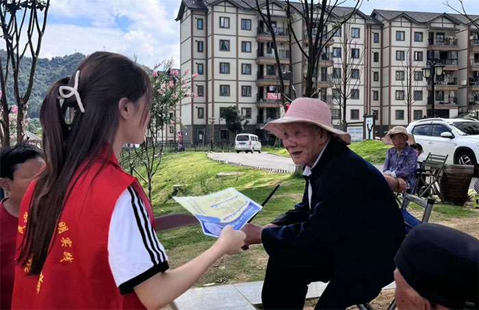 首先是向居民們普及相關的法律知識;顒尤藛T們將實踐隊伍提前制作印發的普法宣傳單分發給居民們,向他們解釋傳單內容,并向居民們了解身邊是否存在詐騙潛在行為以及是否有兒童權利不受保護的情況,向居民們講解常見的詐騙類型,兒童有關的權利,普及相關法律知識,在詐騙暢行的時代讓更多的人遠離毒坑,同時保障孩子們都能健康成長,共創和諧社會。