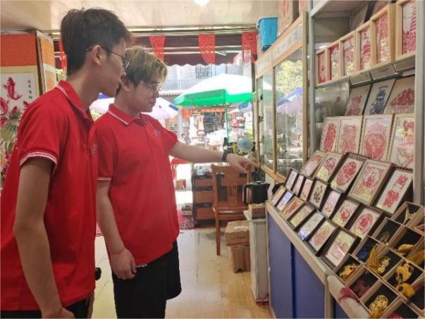 圖為實(shí)踐團(tuán)成員欣賞剪紙藝術(shù)作品。