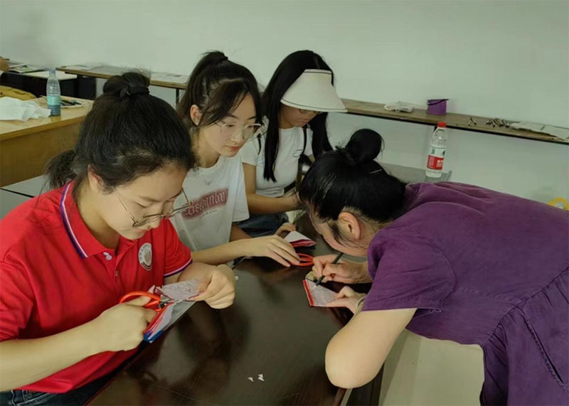 接著,楊君鳳老師帶領(lǐng)實(shí)踐團(tuán)成員一起體驗(yàn)剪紙手工。楊君鳳老師告訴實(shí)踐團(tuán)成員,剪紙最能考驗(yàn)一個人的耐心。只有心態(tài)非常寧靜,專心致志于剪紙工作,才能創(chuàng)造出好看的作品。實(shí)踐團(tuán)成員在學(xué)習(xí)剪紙技術(shù)的過程中,了解了剪紙的制作步驟,也體驗(yàn)到了傳統(tǒng)文化的精髓。