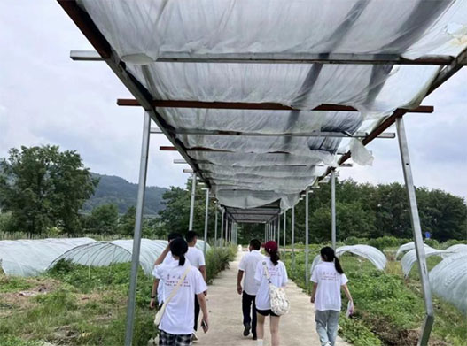 隨后實踐隊員跟隨村干部的腳步來到了生態(tài)產業(yè)園區(qū),一眼望去都是原生態(tài)的瓜果蔬菜,盡管已經是盛夏,但是四周無不展示出勃勃生機。在參觀途中,村干部介紹道,掛扣村現有茶園1100畝,年產茶可達6萬斤,蔬菜產業(yè)園年銷售蔬菜1500噸,西瓜種植基地500畝等諸多產業(yè)。這些產業(yè)極大的幫助了村民脫貧致富。
