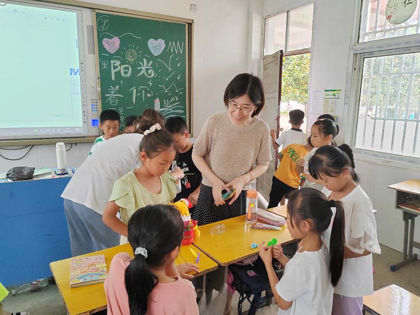 圖為團(tuán)隊(duì)指導(dǎo)老師課間與小朋友互動(dòng)。今日大學(xué)生網(wǎng)通訊員 黃長(zhǎng)飛 供圖
