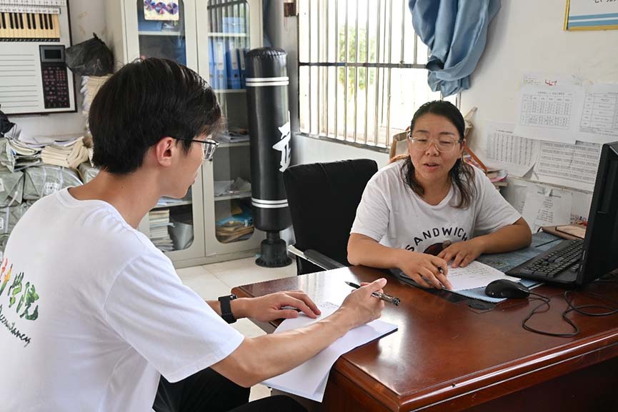 圖為支教團(tuán)成員在采訪劉李學(xué)校鄧?yán)蠋煛=袢沾髮W(xué)生網(wǎng)通訊員 黃長(zhǎng)飛 供圖
