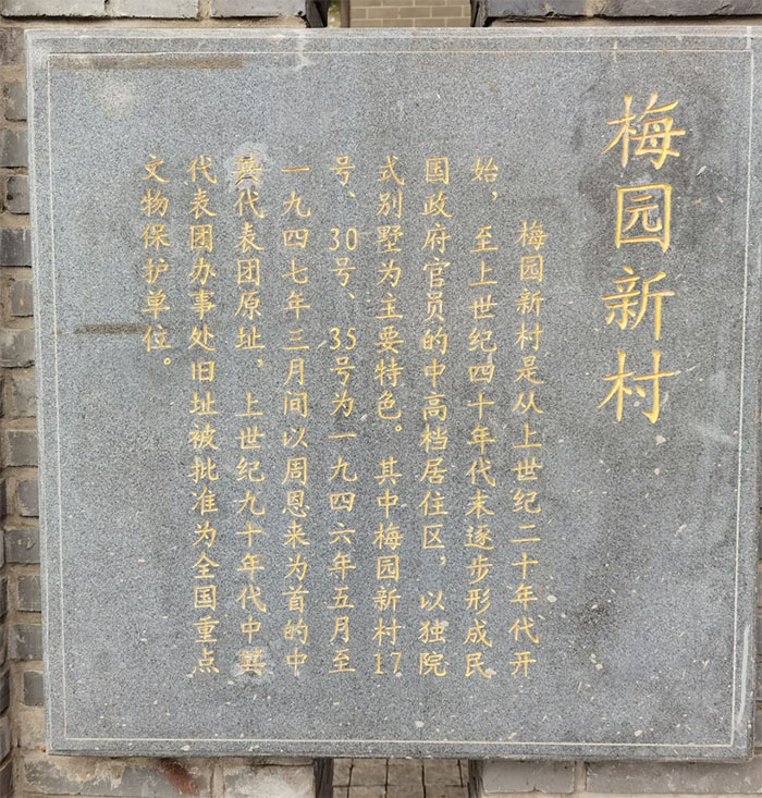 圖為梅園新村石碑,主要記錄了梅園新村的歷史背景以及主要作用。通訊員 顧栓栓 攝