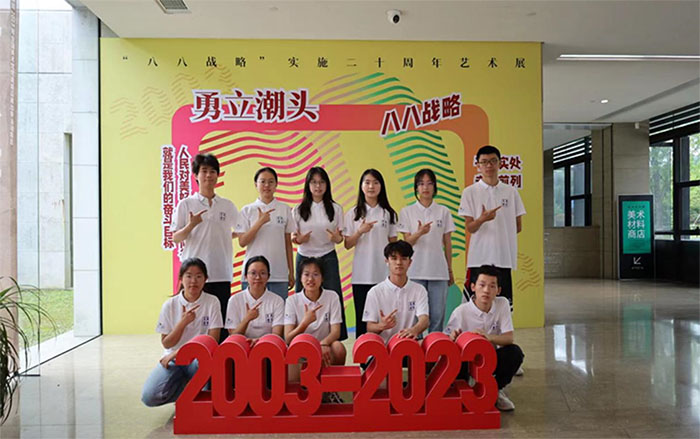 在浙江省美術館,實踐隊參觀了“勇立潮頭——‘八八戰略’實施二十周年藝術展”,通過接觸生動鮮活的美術作品,了解“八八戰略”實施二十年來浙江日新月異的發展,感受輝煌巨變,凝聚奮進力量。