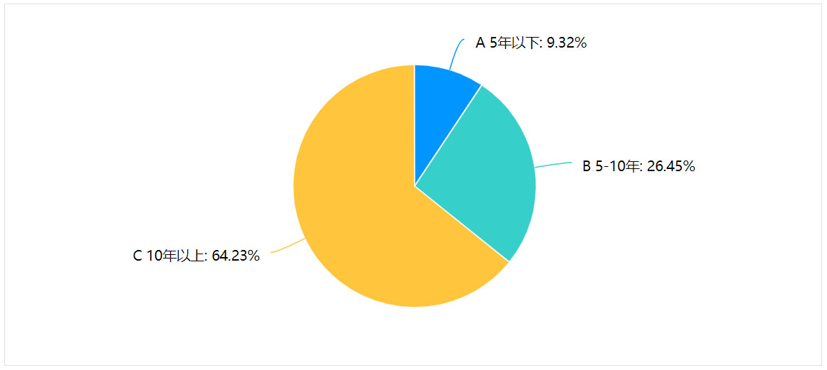 對這397份問卷分析可知,在調查對象中,男性多于女性,占比達到了94.17%,女性只占5.29%(漁民群體絕大部分為男性)。在年齡分布上,調查對象大多為青壯年,各年齡階段分布如下:<18歲,4.53%;18-35歲,31.49%;30-45歲,36.52%;>45歲,27.46%(見圖2)。從學歷情況看,調查對象大多學歷較低,具體學歷分布如下:小學學歷占29.97%;初中學歷占53.65%;高中或中專學歷占15.11%;大專或本科學歷占1.26%;碩士及以上學歷無(見圖3)。調查對象大多尚未退休,工齡大多在10年以上,其占比64.23%,其它工齡分布如下:5年以下,9.32%;5-10年,26.45%(見圖4)。