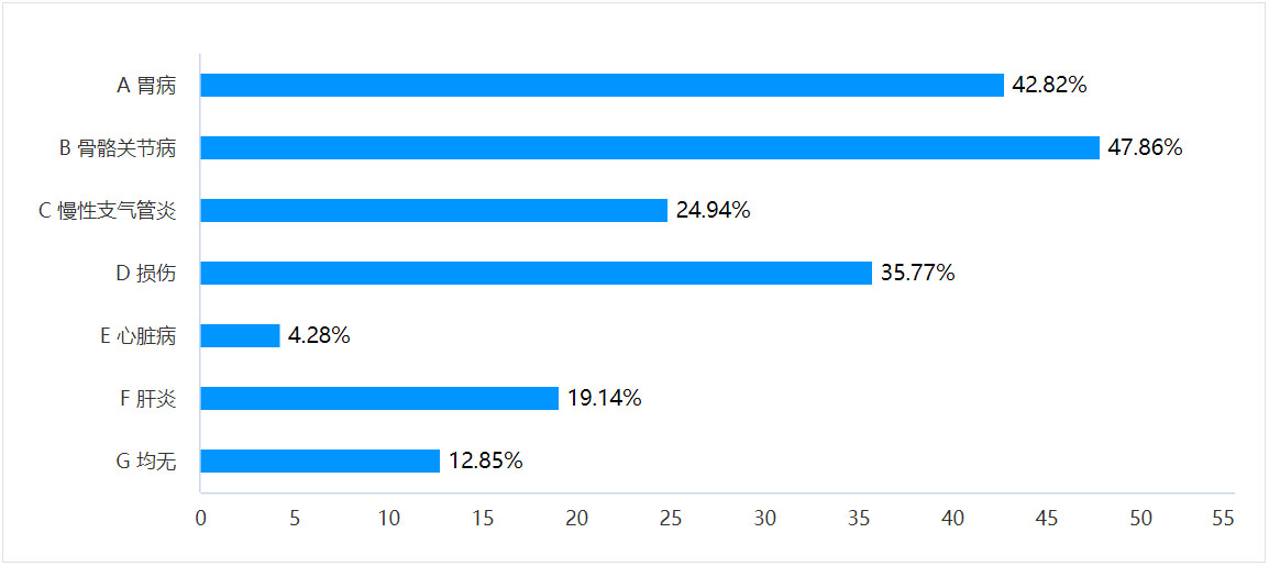 根據調研數據,對于曾患或目前患有的疾病,選擇胃病的有170人,占42.82%,選擇骨骼關節病的有190人,占47.86%,選擇慢性支氣管炎的有99人,占24.94%,選擇損傷的有142人,占35.77%,選擇心臟病的有17人,占4.28%,選擇肝炎的有76人,占19.14%,選擇腫瘤的有8人,占2.02%,選擇均無的有51人,占12.85%(見圖5)。