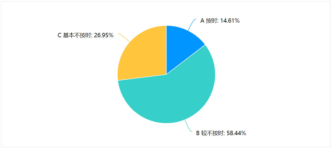 根據調研數據,在用餐時間方面,按時的有58人,占14.61%,較不按時的有232人,占58.44%,基本不按時的有107人,占26.95%(見圖8)。