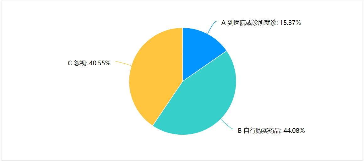 根據調研數據,在身體最初感到不適時,有61人選擇“到醫院或診所就診”,占15.37%,有175人選擇“自行購買藥品”,占44.08%,有161人選擇“忽視”,占40.55%(見圖9)。