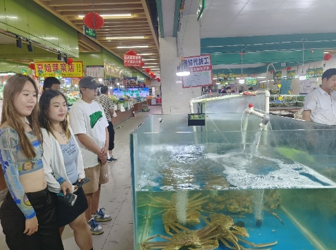 然而,考察期間正值休漁期,使得積米崖碼頭的開放時間相對有限。在金沙灘海鮮市場,實踐隊員通過與商販的交談,深入了解了種類豐富的水產(chǎn)品,涵蓋鮮活海鮮、加工制品、干貨等。調(diào)研還揭示,青島市場主要以魚類、蝦類和貝類為主要銷售品種,新鮮海鮮備受消費者歡迎,同時特色加工產(chǎn)品也頗受青睞。除了新鮮海鮮,特色加工產(chǎn)品也備受歡迎。從蟹黃包到魚丸,這些特色加工品以其獨特的口感和制作工藝吸引了消費者的關(guān)注。這不僅豐富了市場選擇,也為養(yǎng)殖業(yè)的產(chǎn)業(yè)鏈延伸提供了新的方向。