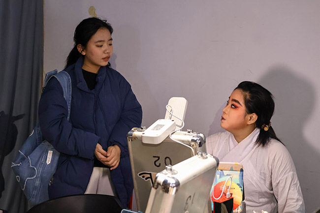 走進閩南水鄉,隊員們沉浸式觀看了常態化活動“周末戲相逢”的薌劇專場演出,并與漳州市歌仔戲(薌劇)傳承保護中心二級演員、福建省戲劇家協會會員楊美莉老師圍繞薌劇的起源、發展與兩岸傳播交流現狀進行了深度對話。楊老師結合表演實踐,生動闡釋了閩南語“文白異讀”在角色塑造和增強戲劇表現力中的妙用。同時,她欣慰地表示能夠看到如今薌劇受眾群體跨越年齡圈層的趨勢,與隊員們交流了通過沉浸式演出打破“第四堵墻”的模式,為隊員們探索閩南語在戲曲領域的發展提供了具有可行性的新思路。
