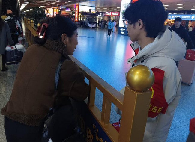 上崗之前,武昌站的資深工作人員為學(xué)子們開展了系統(tǒng)全面的崗前培訓(xùn),從武昌站的整體布局、候車區(qū)域分布、檢票口動(dòng)線規(guī)劃,到旅客出行中最常咨詢的車次查詢、換乘指引、行李寄存等問(wèn)題解答,再到電梯應(yīng)急按鈕的使用方法、緊急情況的復(fù)原措施以及旅客突發(fā)狀況的處置流程,師傅們傾囊相授,反復(fù)叮囑大家要沉下心來(lái)、做好每一個(gè)細(xì)節(jié),用責(zé)任筑牢春運(yùn)服務(wù)的安全防線。深知春運(yùn)工作的重要性,也珍惜這次實(shí)踐鍛煉的機(jī)會(huì),面對(duì)龐大的客流和師傅們交付的重任,學(xué)子們絲毫不敢懈怠,把培訓(xùn)內(nèi)容牢記于心,只為以最佳狀態(tài)迎接旅客的每一次咨詢、每一個(gè)求助。上崗第一天,大家便卯足了精神,以飽滿的熱情堅(jiān)守在各自崗位,認(rèn)真對(duì)待每一位旅客,用微笑開啟春運(yùn)服務(wù)的旅程。“同志,進(jìn)站口怎么走?”“請(qǐng)問(wèn)往長(zhǎng)沙的車在哪個(gè)候車室?”這些簡(jiǎn)單卻高頻的問(wèn)題,成為了學(xué)子們每天的工作日常,他們始終耐心細(xì)致、不厭其煩地為旅客指明方向,引導(dǎo)大家安全有序進(jìn)站乘車,用一聲聲指引、一次次抬手,為旅客的出行保駕護(hù)航。