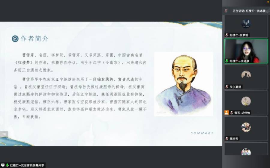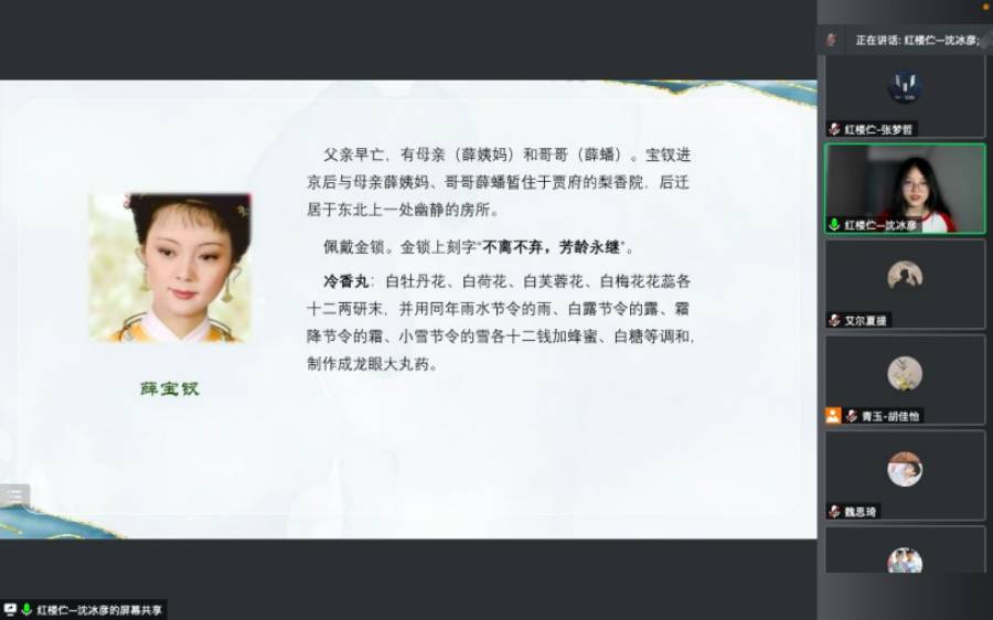 因為疫情的影響,通過兩隊隊長的協商,最終確定支教線上進行,以騰訊會議作為媒介。課堂主題是《紅樓夢》導讀。《紅樓夢》以賈、史、王、薛四大家族的興衰榮辱為背景,以富貴公子賈寶玉出生所銜的玉為視角,以賈寶玉與林黛玉、薛寶釵的愛情婚姻悲劇為主線,描繪了一些閨閣佳人的人生百態及大家族由盛及衰的血淚史,展現了真正的人性美和悲劇美,可以說是一部從各個角度展現女性美以及中國古代社會百態的史詩性著作。希望能通過這次授課,引發孩子們的思考,讓孩子們有所收獲,激發孩子們對以《紅樓夢》為代表的中國古典文化的興趣。