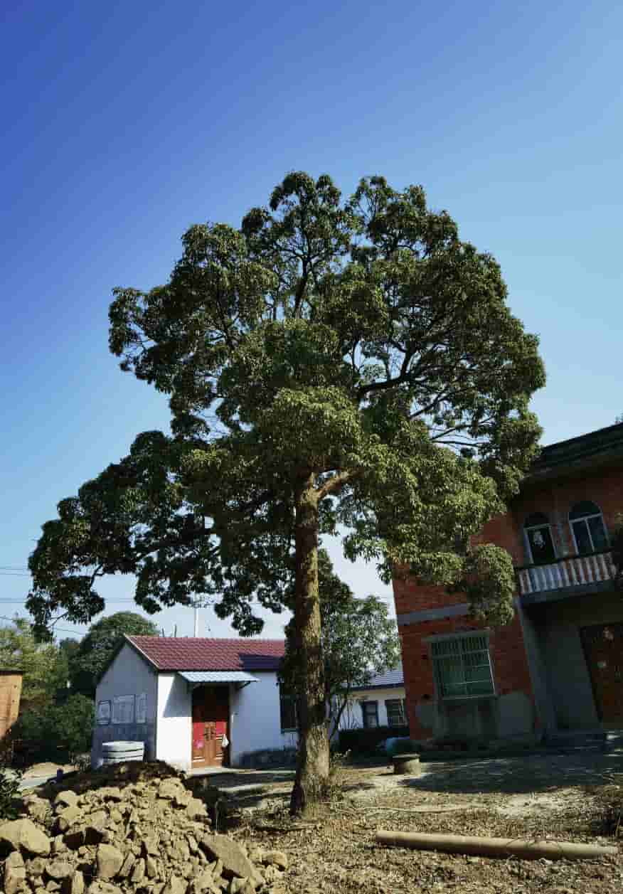 進入老街巷中,可以看見很多參天大樹,真實的場景真讓人為之癡狂,在不到零點幾平方公里的范圍內,竟然存在想都不敢想、見所未見聞所未聞的好幾種巨無霸級道地原生鄉土樹種:樹齡將近400年、胸徑100厘米以上、高度約20米、冠幅足有30米楓香一株,這么大冠幅的楓香樹在合肥乃至安徽省絕對首屈一指;高10米、冠幅10米、胸徑45厘米的苦櫧一株;高10米、冠幅10米、胸徑超40厘米的冬青(紅果冬青);高15米、冠幅15米、胸徑60厘米的肥皂莢一株;據當地老百姓說,這幾株樹齡也都在100年以上。還有一株高10米、冠幅8米、地徑50厘米、好幾十個分枝的潢川金桂王一株。這些古樹都是頂天立地、不可再生獨樹一幟的珍貴資源,極具保護研究價值。然截止目前它們還沒有登記在冊、沒有掛牌保護,合肥2654株古樹名單中還沒有它們的名分,它們還在苦苦等待古樹垂青時刻的到來。
