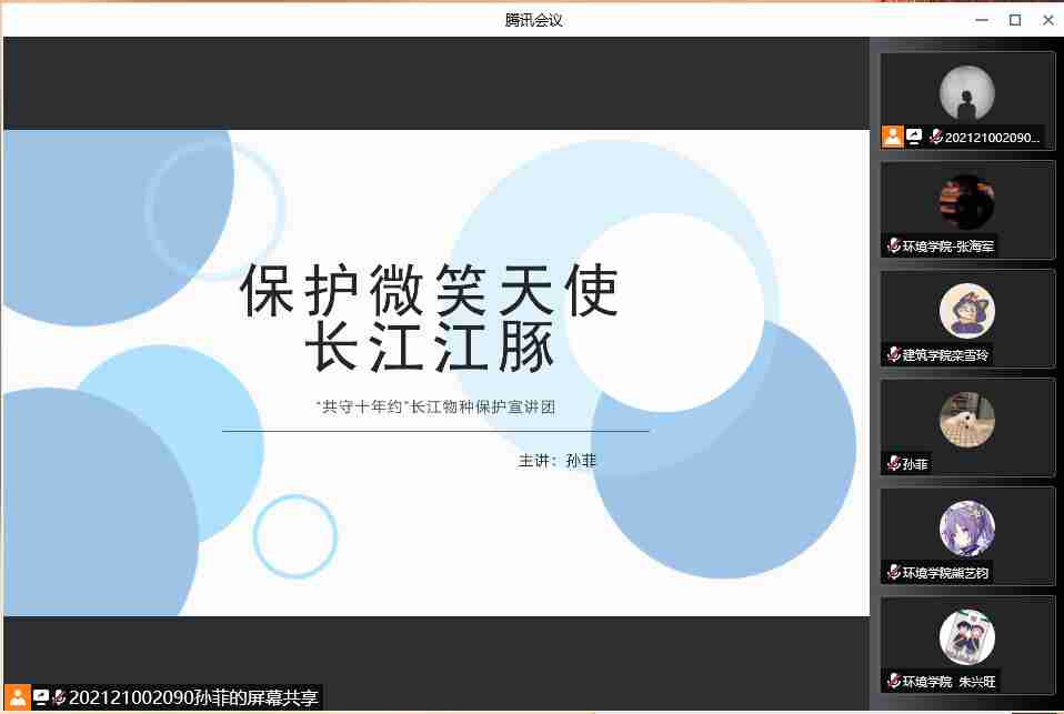 線上宣講,分享實踐成果為積極宣傳長江生態大保護的重要意義,引導大學生們了解并關愛和保護“水中熊貓”——長江江豚,8月10日晚,團隊宣傳組開展《保護微笑天使-長江江豚》科普云課堂。學院團委負責人陳亞會、團隊指導教師楊靜、學院各年級學生以及兄弟院校多名學生等參加。