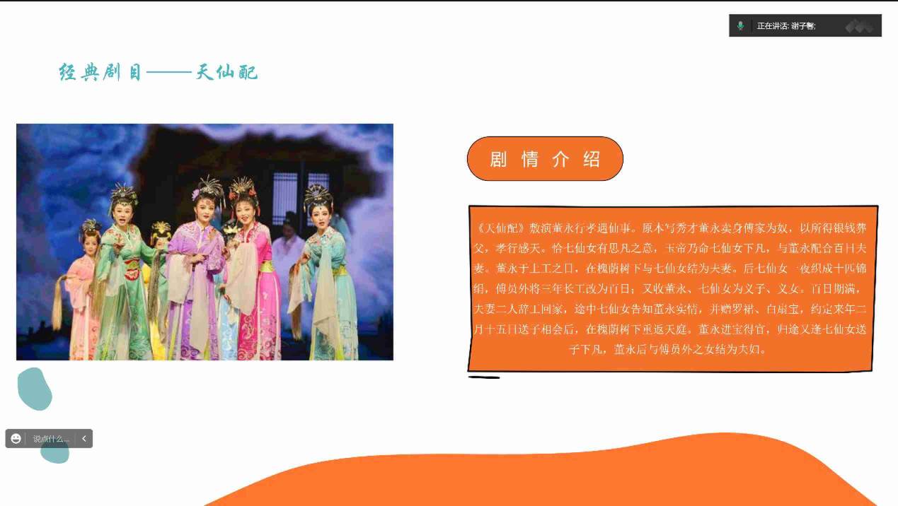 最后,結合鹽城地方特色,我們向孩子們介紹了中國五大戲曲劇種之一——黃梅戲,并選取與鹽城東臺有著特殊淵源的黃梅戲代表作《天仙配》重點介紹。通過傳播優秀傳統文化,我們希望能夠幫助孩子們樹立文化自信,也愛上黃梅戲這種傳統戲曲,為傳統文化的傳承與保護貢獻自己的力量。