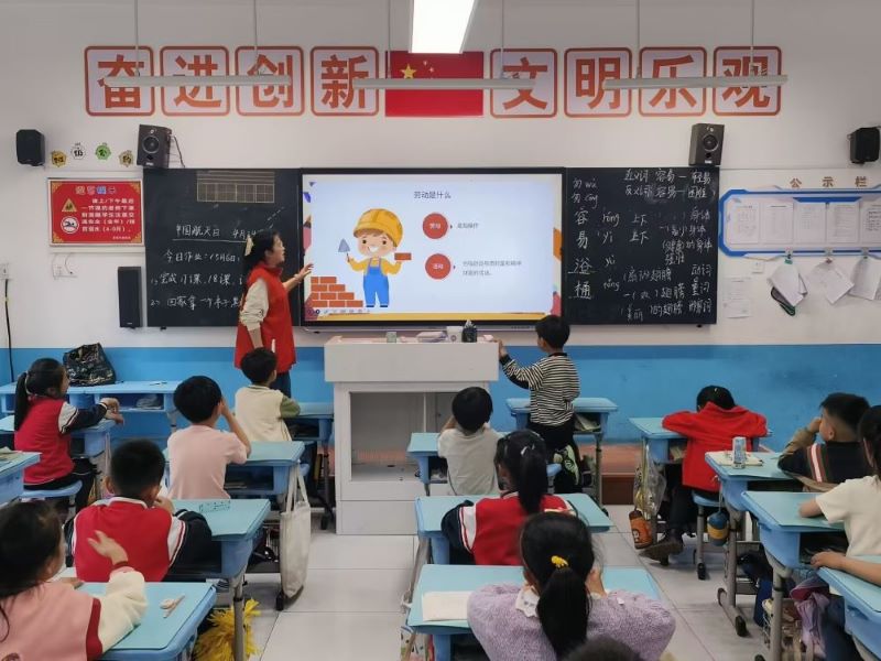 活動伊始,周堃帶領志愿者在花山小學門口集合并進行簽到。到達班級后,支教講師李申婷通過播放生動形象的幻燈片向同學們介紹“國際勞動節” 的相關知識。先后介紹了什么是勞動節、勞動節的由來以及生活中的勞動事跡。講課過程中,孩子們遇到不會的問題,會向志愿者詢問。志愿者們也會和孩子們進行解釋,同孩子們就日常生活中遇到的問題進行交流。隨后,志愿者播放了關于勞動教育的視頻,學生們在視頻的播放下,積極討論交流,課堂氣氛達到高潮。在視頻結束后,志愿者號召孩子回去多幫父母們做做家務,感受勞動帶來的幸福體驗。最后,志愿者在花山小學門口合照留念。至此,本次活動圓滿結束。