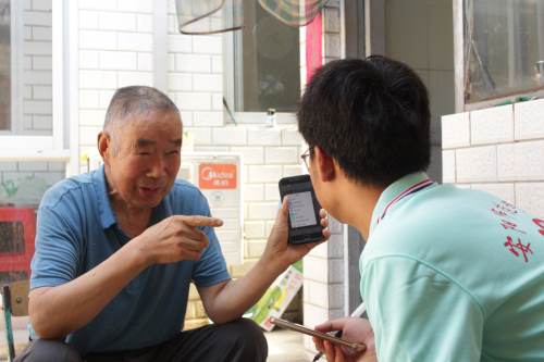 圖為問渠青訪團成員采訪郝順才爺爺