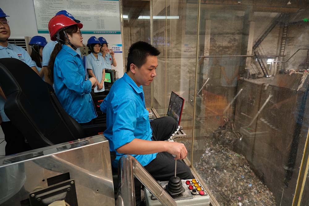 隨后來到操作室,窗外便是20米深的垃圾填壓倉,入倉的生活垃圾將在這里靜置三天達到合適的燃燒熱值并濾出廢液進入凈化流程。隨后,由操作人員操作垃圾吊車將垃圾吊進料斗,進入焚燒爐進行焚燒處理。焚燒氣體在經過凈化達標之后排入大氣,焚燒殘留的灰渣也可用于制磚或者路面穩定層。同時,焚燒所產生的熱量將會被用于供給一套氣動發電機工作,滿足三萬戶家庭的用電需求。在聽講解員講解的同時,操作人員也為同學們展示了吊車的工作流程。