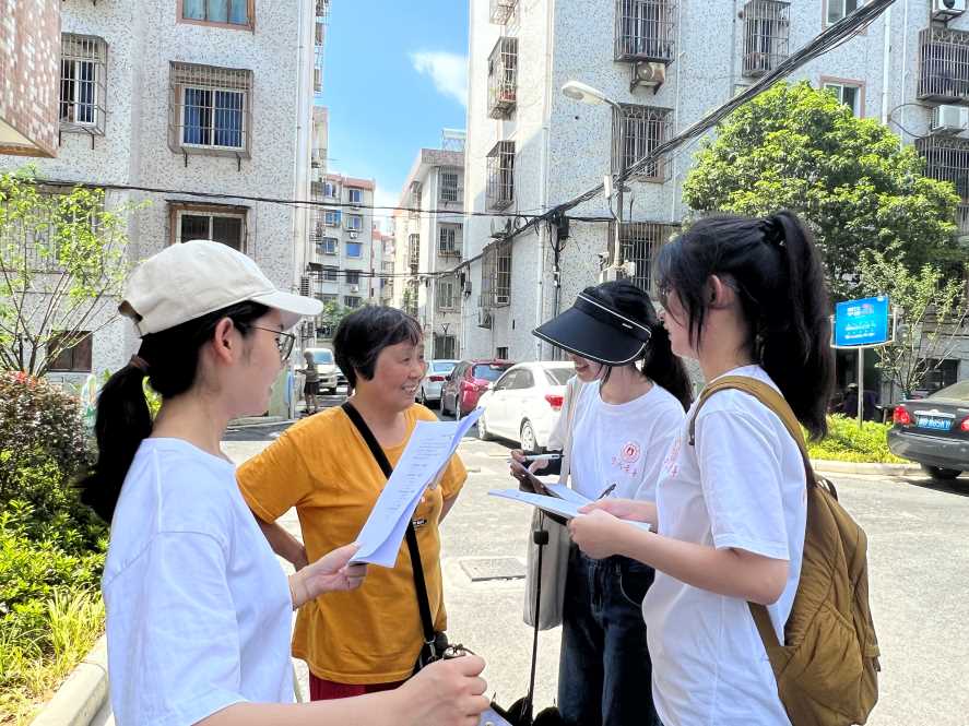 圖為實踐隊隊員對寧波市鎮海區白龍社區居民進行問卷調查。