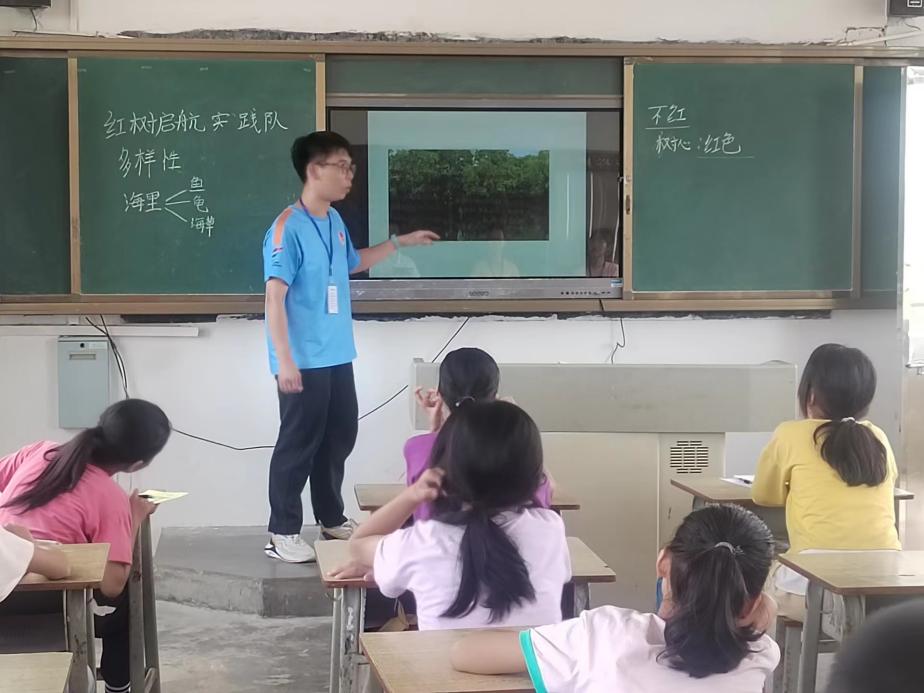 7月7日,在當地民眾和領導的支持下,我們團隊在探塘小學開展紅樹林主題課堂——紅樹林之旅。在我們隊伍成員講授相關知識的過程中,同學們對紅樹林的這一課題相當感興趣,整堂課下來也讓我真切感受到鄉村孩子對知識的好奇和渴望,而我也被這樣的熱情和純樸所打動。