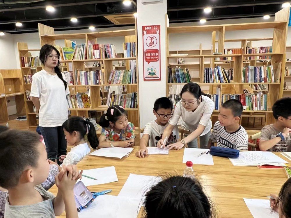 圖為實(shí)踐隊(duì)隊(duì)員在檢查孩子們的答卷