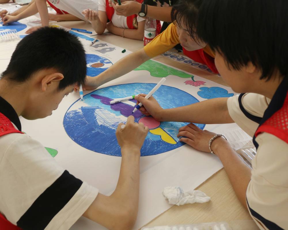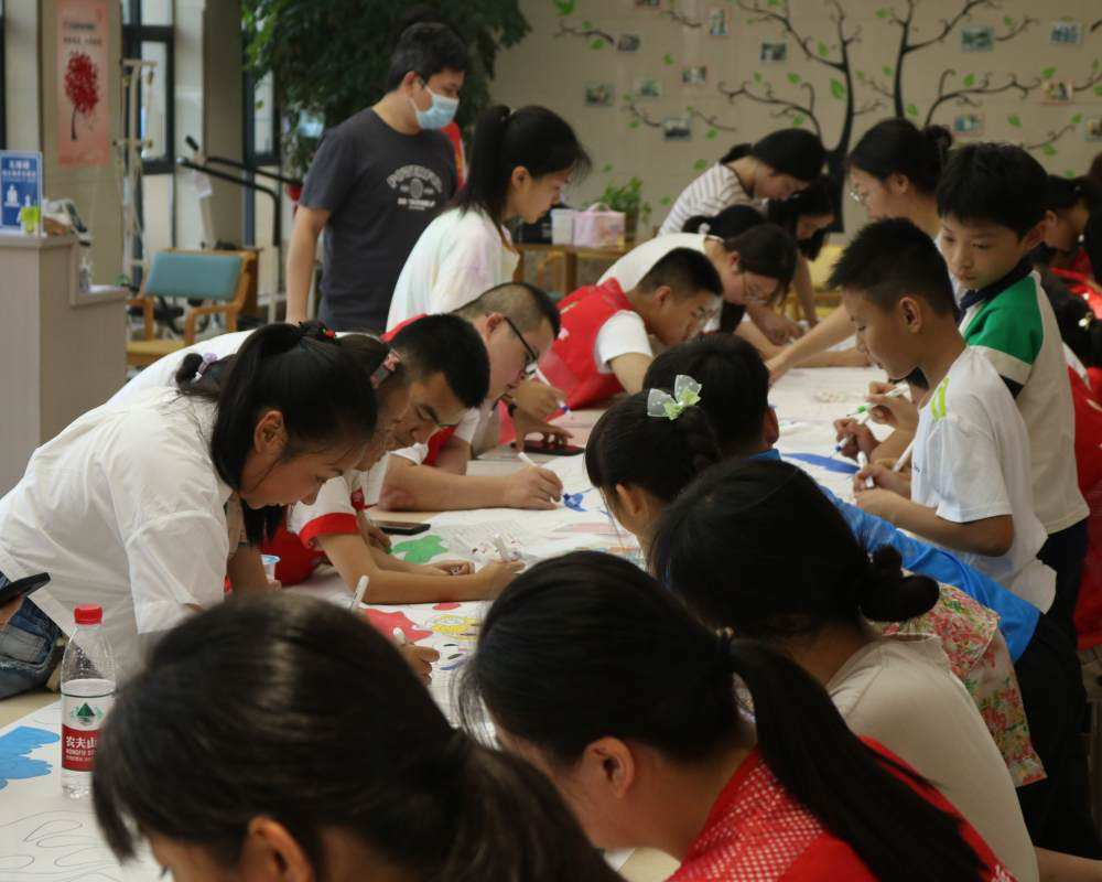 繪畫班的小孩子們也來到平陽養和醫院幫助殘疾人畫畫報,稚嫩的臉上洋溢出燦爛的微笑。在畫畫報的過程中,小孩子們手執畫筆讓畫報逐漸變得五顏六色,各個色彩交相輝映。隨著精彩的作品在畫報上逐漸顯現,我們不僅看到了一幅絢麗的畫報,還看到了祖國未來花朵的多方面成長。