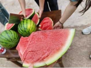7月10日,重慶三峽學院工商管理學院“薪火鄉傳”團隊重新乘車返回了萬州區龍駒鎮燈臺村,這是團隊暴雨結束后再一次來到這里,和燈臺村村民一起為西瓜節做好準備工作。到達村里后,第一件事便是“深入”瓜棚,有一部分西瓜地已經被洪水損壞,于是駐村書記帶領大家參觀了完好的西瓜棚。團隊在西瓜棚里選擇了成熟的大西瓜,搬運回住宿的農家樂,并在村民和書記的見證下現場開瓜。