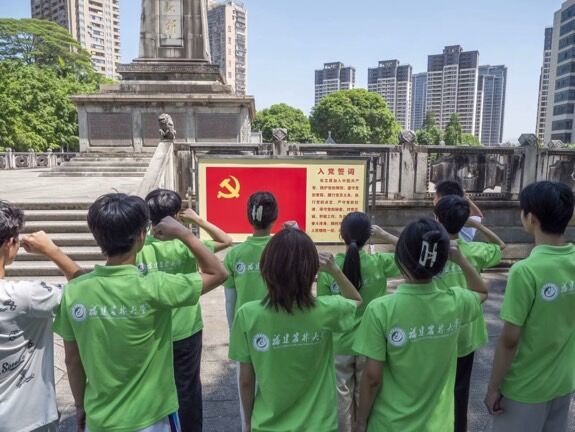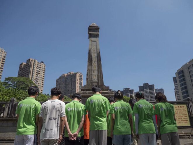 接著,實(shí)踐隊(duì)來(lái)到人民英雄紀(jì)念碑前,面對(duì)碑前熠熠生輝的黨旗,不由得心潮澎湃。在學(xué)院團(tuán)委書記王榮華老師的帶領(lǐng)下,同學(xué)們握緊右拳高舉過(guò)肩,莊嚴(yán)宣誓。隨后,實(shí)踐隊(duì)面對(duì)人民英雄紀(jì)念碑肅立默哀、鞠躬,表達(dá)對(duì)革命先烈的緬懷之情與崇高敬意。
