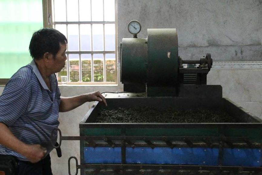 上圖為茶園員工對茶葉制作機器進行操縱 程白云 攝