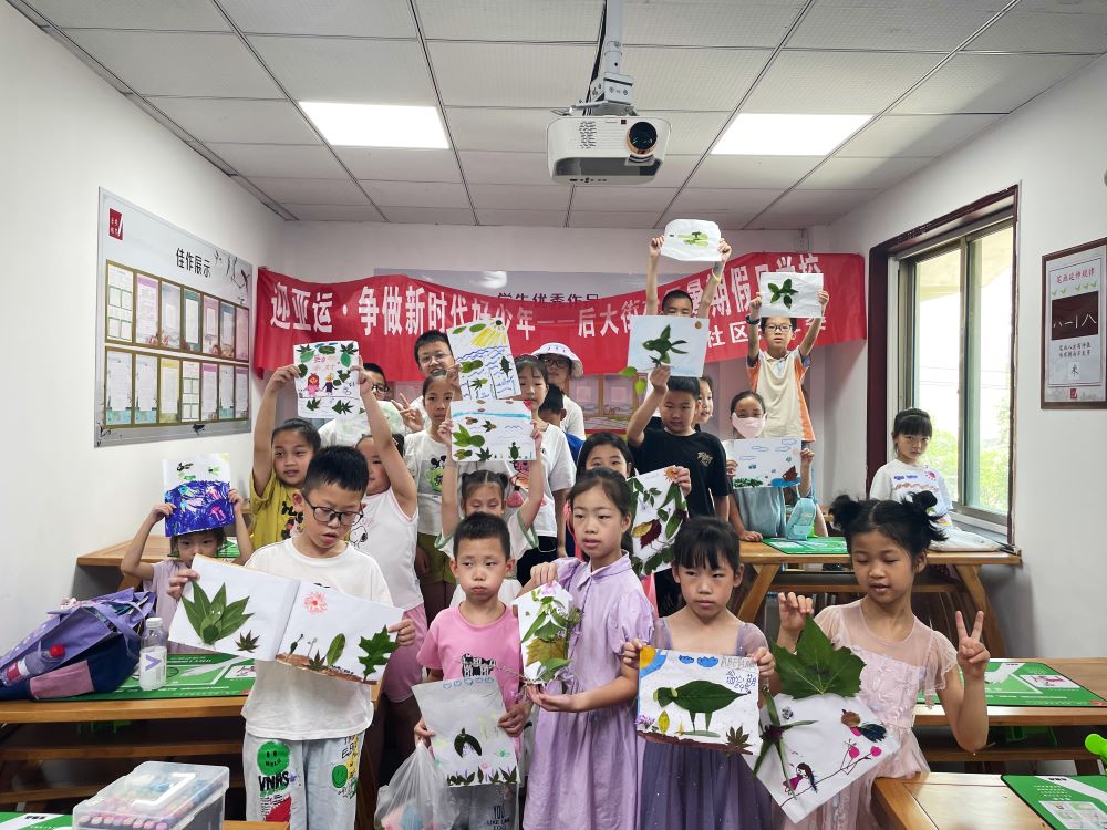 圖為實踐隊隊員在給孩子們上樹葉拼貼課