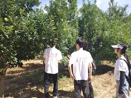 隨后村干部帶領(lǐng)我們前往當(dāng)?shù)毓麍@,并向我們介紹了果樹的種植過程與種植時間,果園主要種植紅星蘋果,少數(shù)種植山楂。北田鎮(zhèn)有多家蘋果收購站,實踐小隊成員向當(dāng)?shù)厝肆私猓t星蘋果作為北田鎮(zhèn)的主要種植物,將銷往河南、河北等多地。
