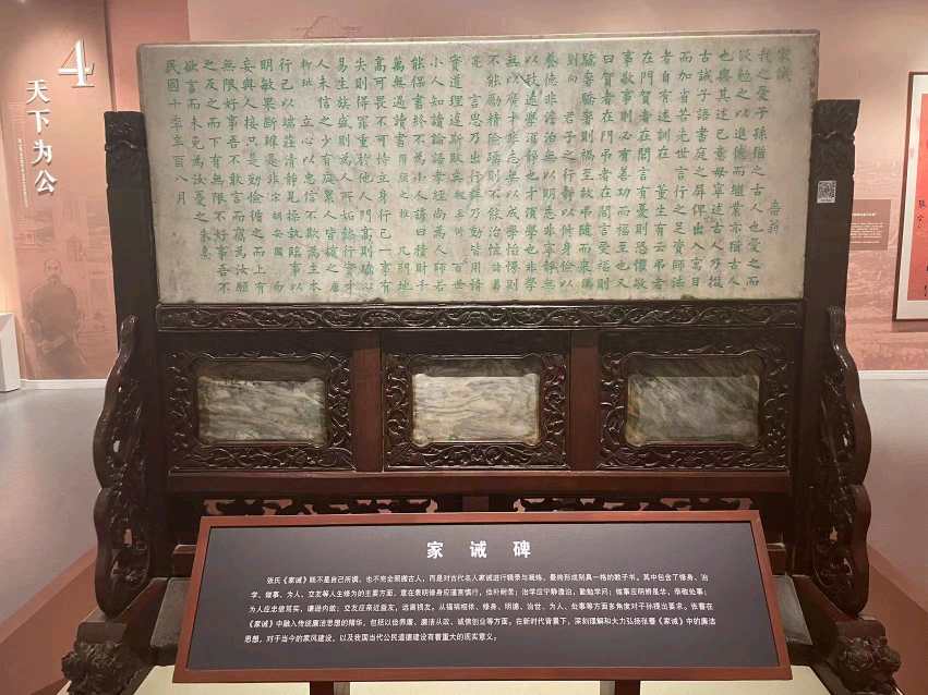 尋訪并拍攝完濠南別業后,實踐隊伍來到了南通博物苑新館二樓。這里是張謇廉正思想的陳列專區。作為深受中華傳統儒家文化熏陶的知識分子,張謇秉承了“以天下為己任”的優良傳統,以“救國救民”為己任,一生都在探求救國救民的道路,不畏艱難曲折。進館后,赫然眼前的是《家誡碑》,上面篆刻著張謇對家人及后世的諄諄教誨。
