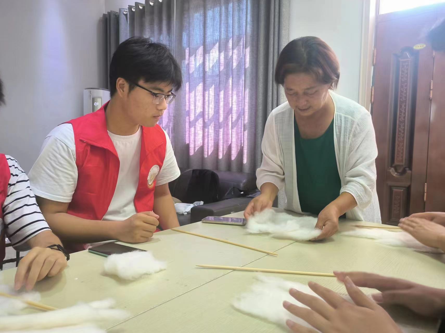 圖為采訪呂養芹老師最后,在跟隨實踐團隊成員學習制作搓捻子、穿串珠、制作扭扭棒花束等手工藝品的過程中,我深刻地感受到了傳統手工藝的魅力和價值。這些手工藝品不僅具有實用性,而且還蘊含著深刻的文化內涵。通過學習這些手工藝品的制作過程,我也更加深入地了解了傳統手工藝的制作工藝和技巧。這些手工藝品的制作過程非常繁瑣,需要手工藝人付出巨大的努力和心血。制作搓捻子需要細致的手法和準確的力度,穿串珠則需要耐心和細心,而制作扭扭棒花束則需要巧妙的構思和靈活的手法。但是,正是因為這些手工藝品的制作過程非常繁瑣,所以這些手工藝品才顯得更加珍貴和有價值。