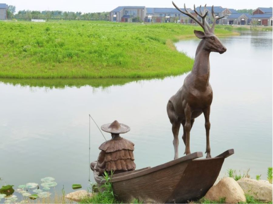 圖為濕地人與麋鹿和諧相處的雕塑。通訊員 徐立 攝